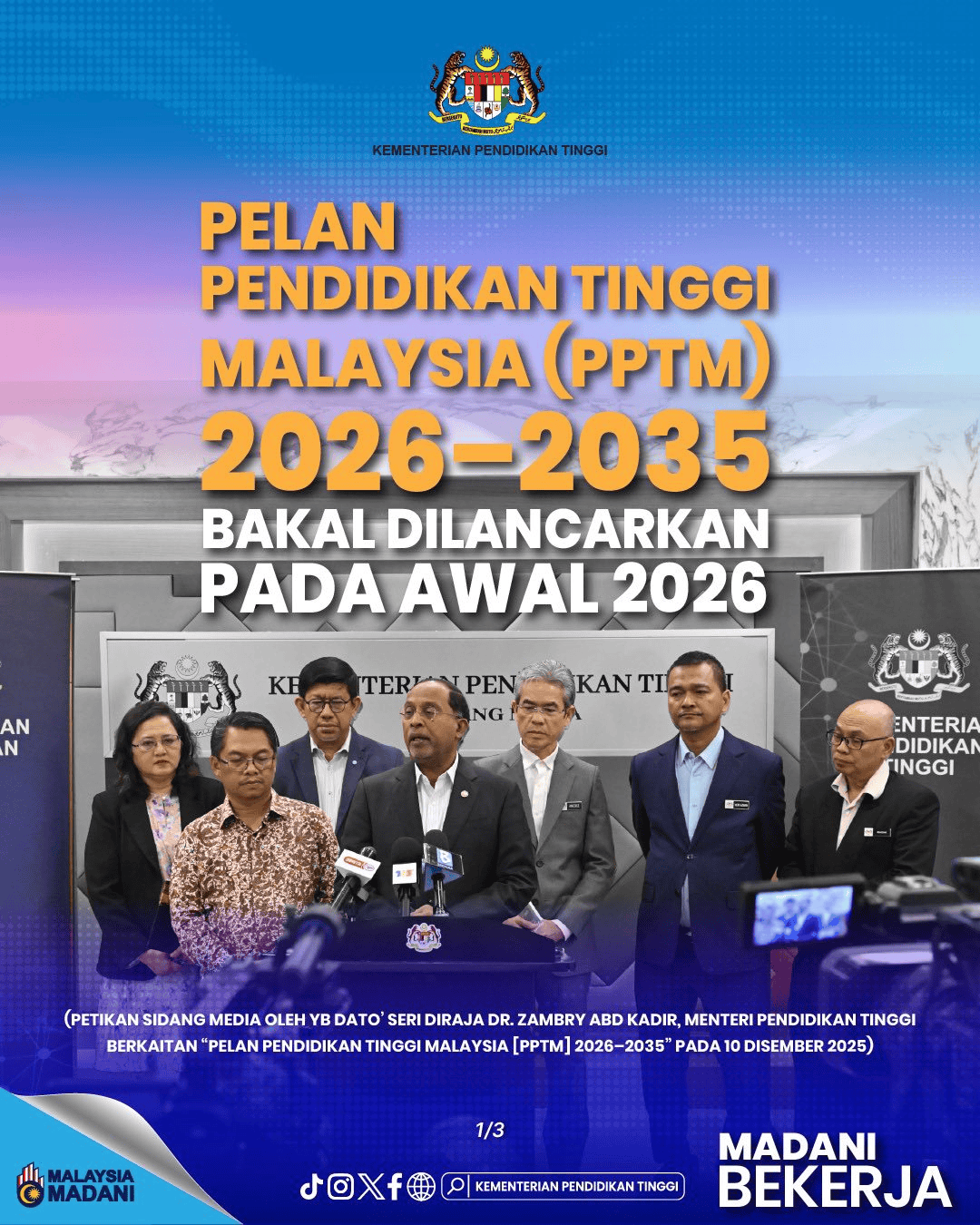 Le Plan malaisien pour l’enseignement supérieur (PPTM) 2026-2035 sera officiellement lancé par le Premier ministre au cours de la deuxième semaine de janvier 2026. Visitez le portail officiel du ministère de l’Enseignement supérieur (KPT) pour découvrir les nouvelles orientations et les changements dans le monde de l’éducation au lien suivant : www.mohe.gov.my/