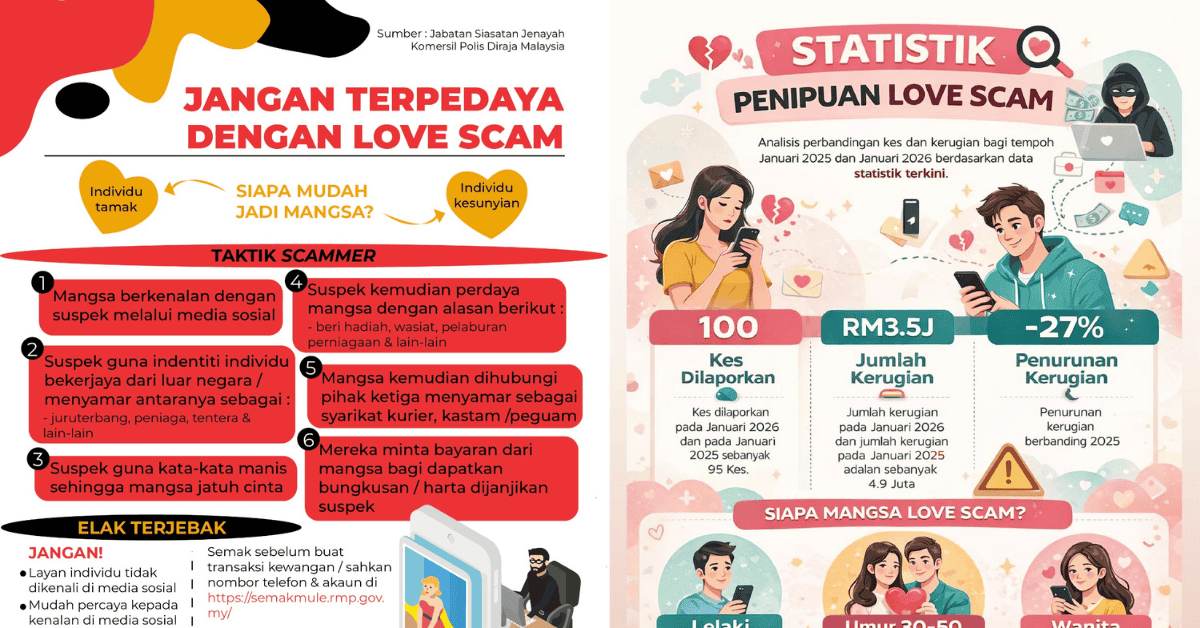 Pour plus d’informations sur cette arnaque amoureuse, veuillez contacter le NSRC au 997 ou visiter le Département des enquêtes sur les délits commerciaux FB – JSJK PDRM