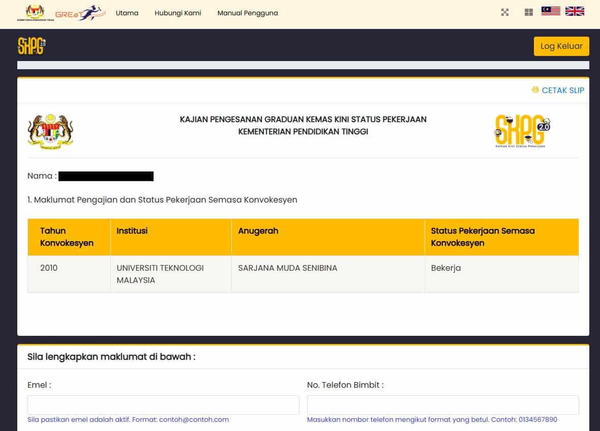 SKPG2.0 très important pour tous les diplômés qui veulent s’assurer leur statut de carrière est correctement mis à jour après l’obtention de leur diplôme. Il aide KPT et tous les EES à comprendre la valeur marchande des diplômés dans le monde réel du travail.